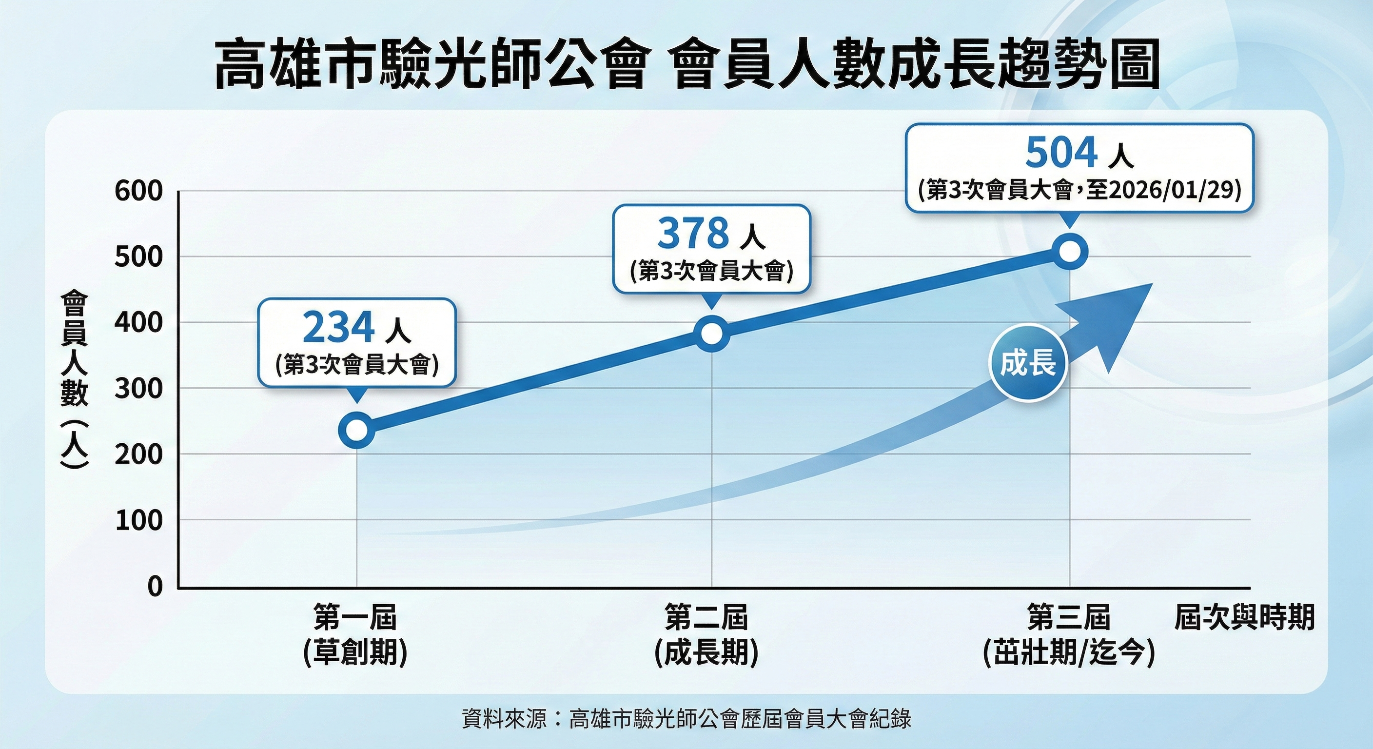 次會員大會),歷經第二屆穩定成長至 378 人(第二屆第 3 次會員大會),直至今日第三屆已突破 500 大關,達到 504 人(統計至 2026 年 1 月 29